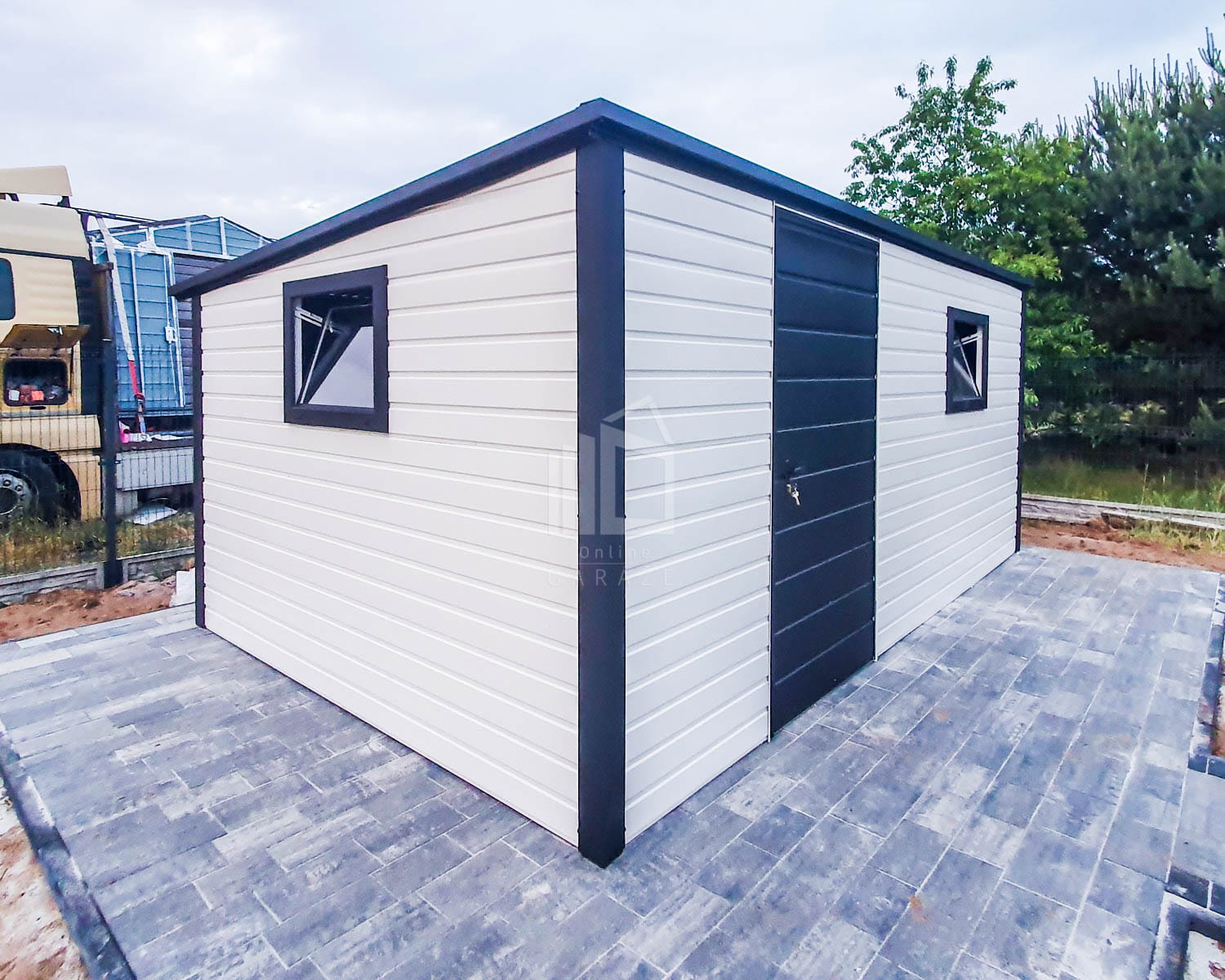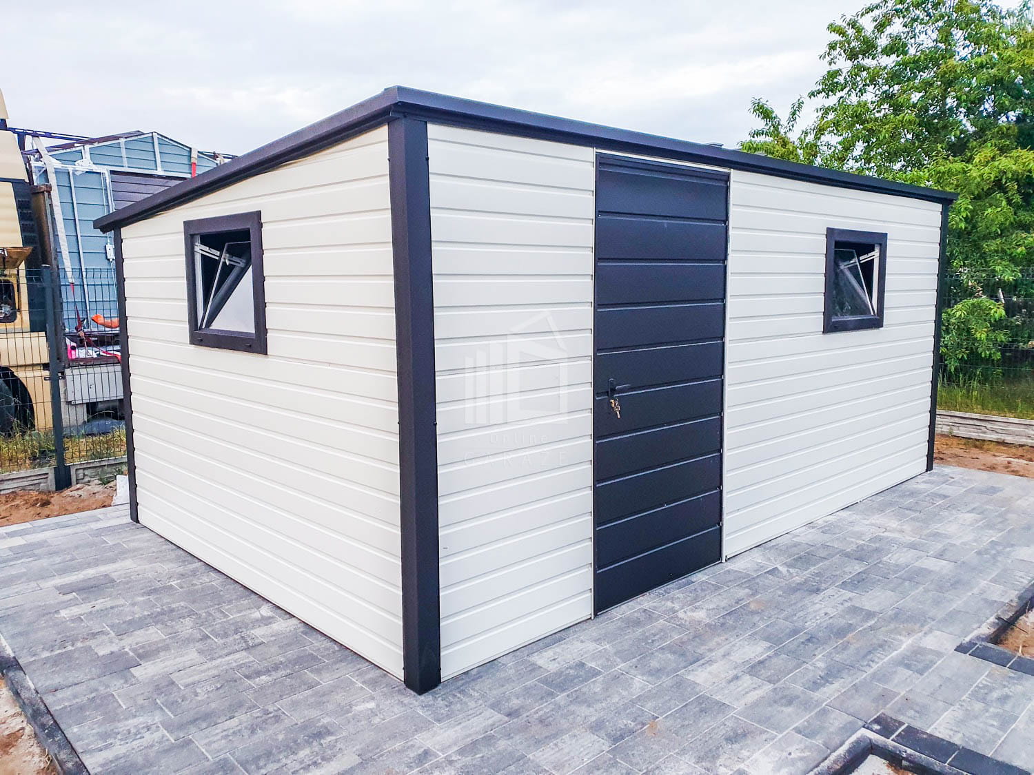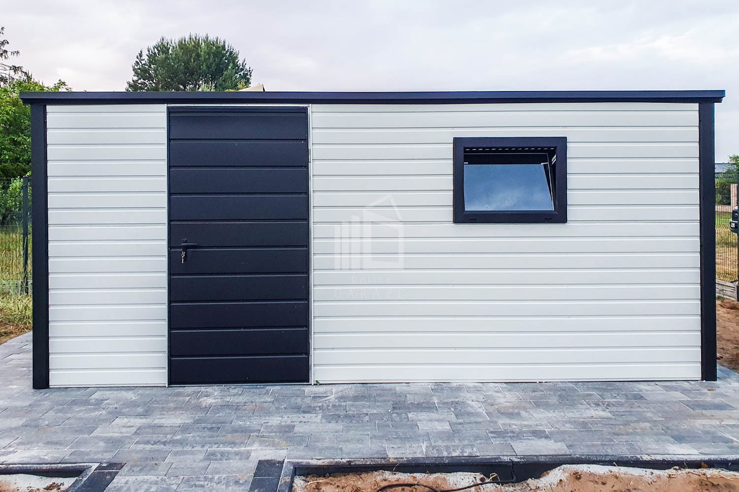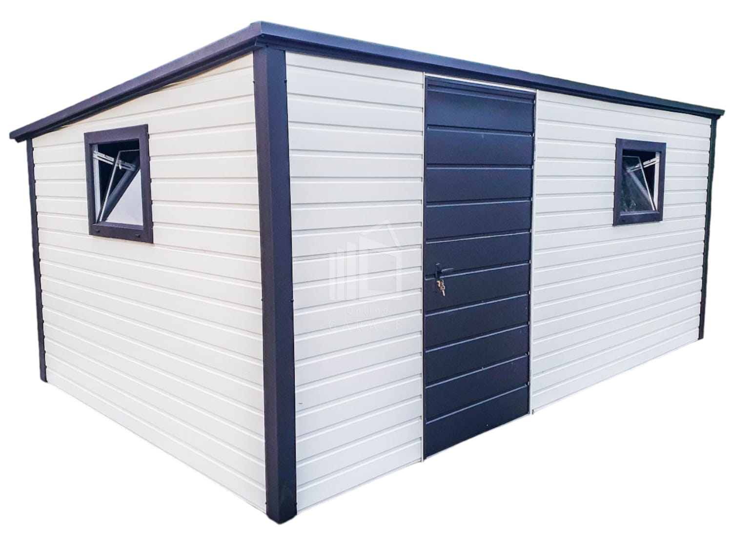 Záhradný domček 5×3,5 – Dvere – 2x Okno – Biela – Čierna – spád dozadu TS724