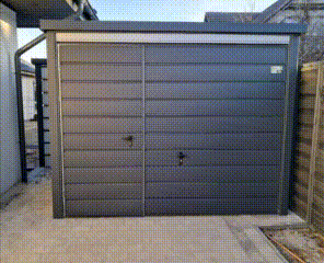 Plechová garáž 3×5 m – výklopná brána – dvere – strieborná – antracit – strecha so spádom dozadu TS1061