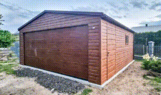 Garáž plechová – 6×5 Sekčná brána – dvere – 2x okno – rynny – tmavý orech – drevodekor – sedlová strecha TS751