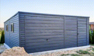 Plechová garáž 6m x 5,80m vodorovný – spád dozadu – výklopná brána + dvere + 2x okno – antracit TS274